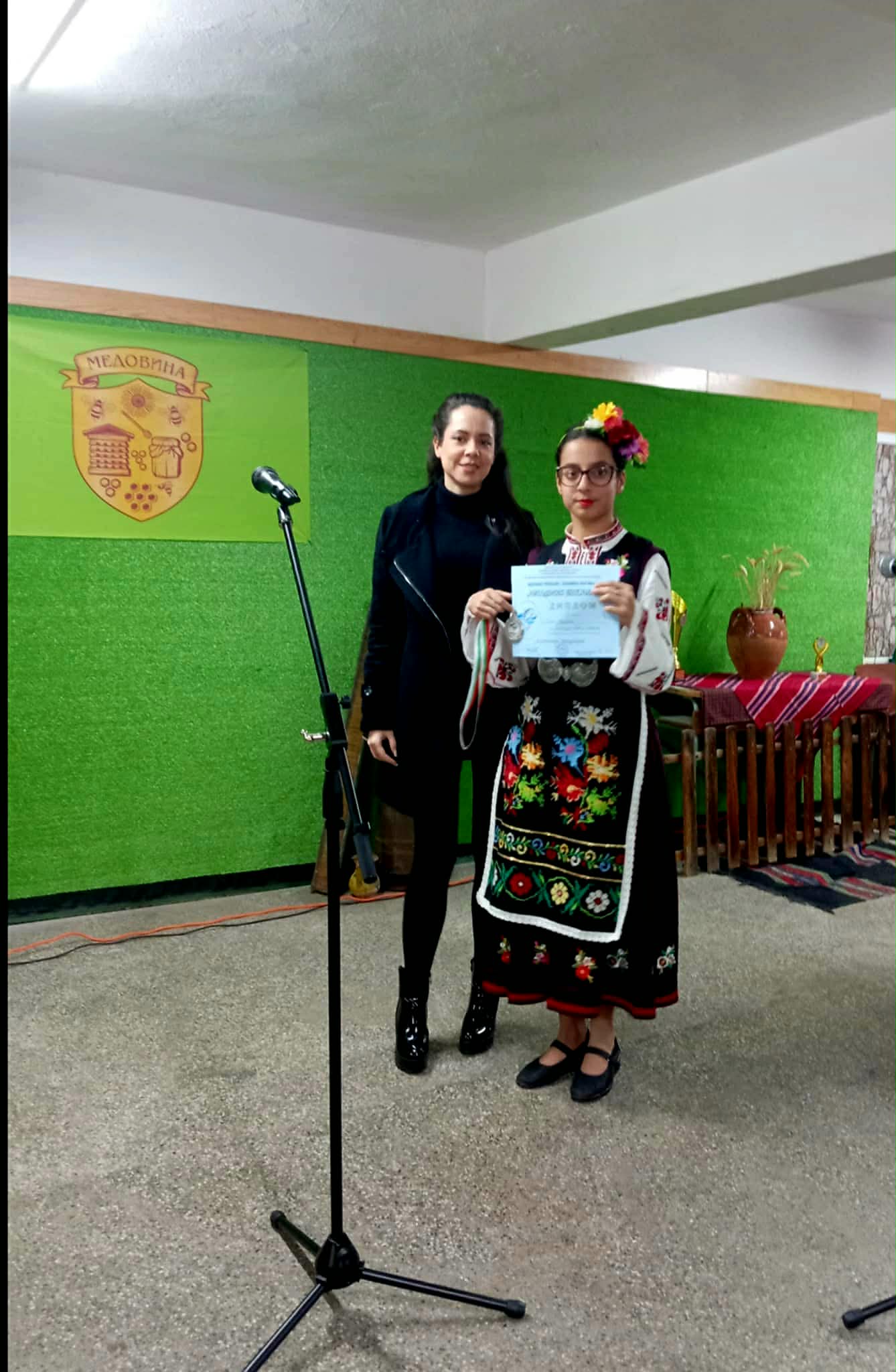 Второ място и сребърен медал за Севги Реджеб от Детска фолклорна група „Перуника“ с вокален педагог г-жа Русанка Андонова в Раздел: Народно пеене.