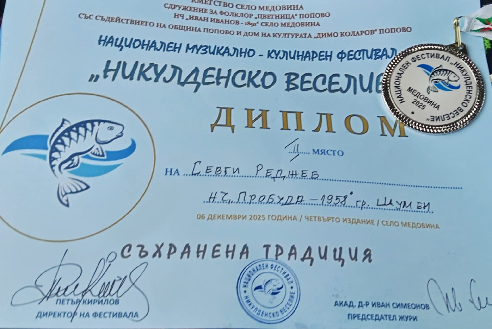 Второ място и сребърен медал в Раздел: Народно пеене за Севги Реджеб от Детска фолклорна група „Перуника“ с вокален педагог г-жа Русанка Андонова.