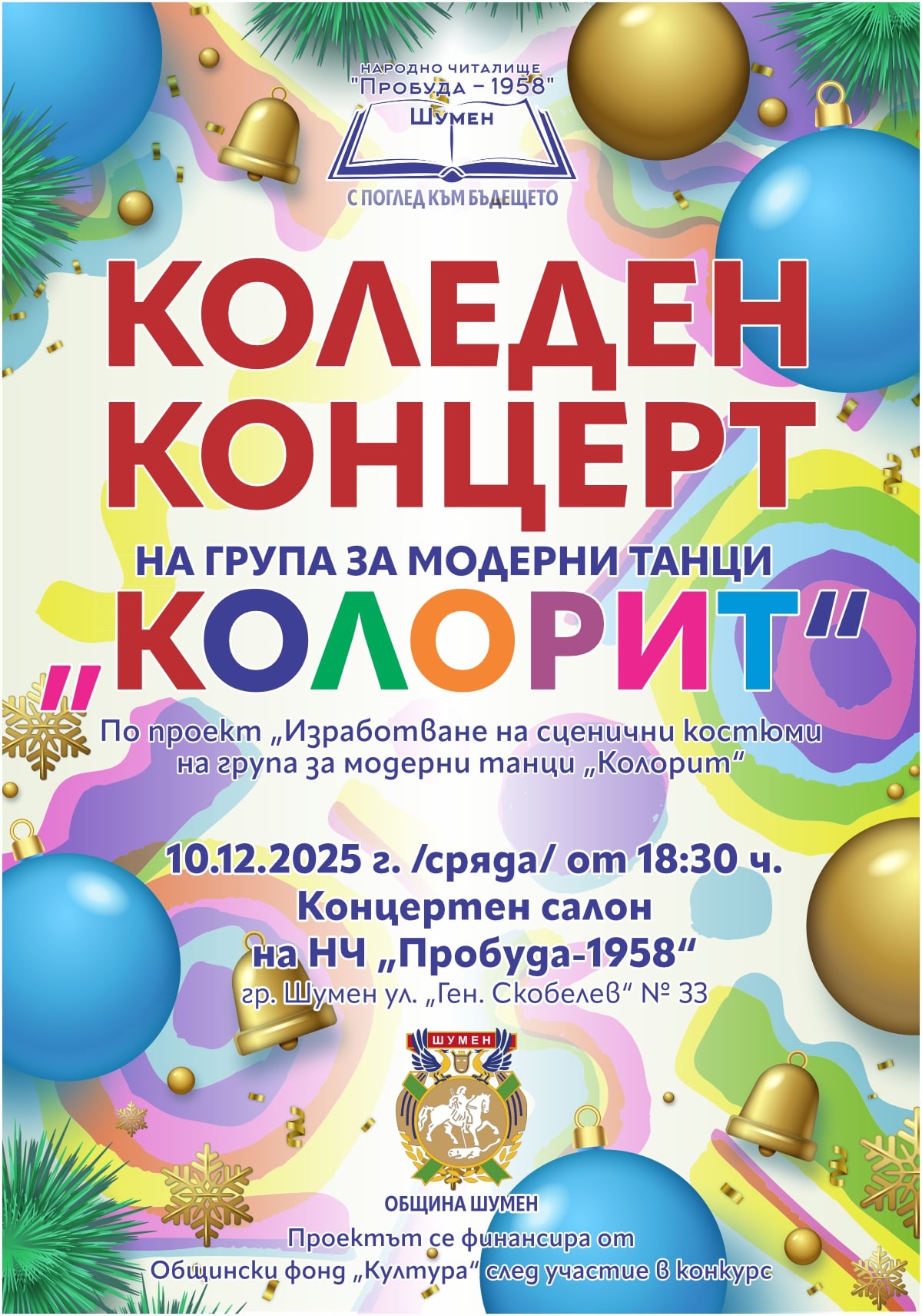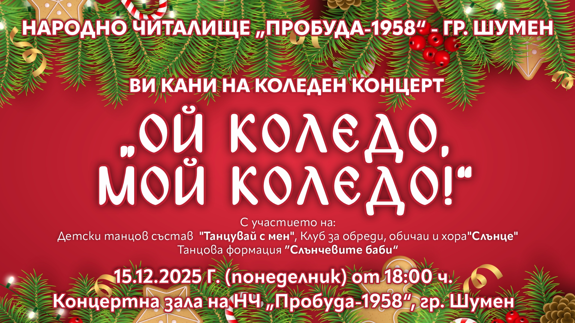 И ОЩЕ КОЛЕДНИ ВЪЛНЕНИЯ ПРЕДСТОЯТ!!!!!! Коледен концерт „Ой, Коледо, мой Коледо“ с участие на: Младежки танцов състав „Танцувай с мен“, Клуб за обреди, обичаи и хора „Слънце“ и Формация „Слънчевите баби“, с ръководител Веселина Дечева. Дата: 15.12.2025 г. /сряда/ Място: Концертния салон на НЧ „Пробуда-1958“, Шумен Час: 18:00 ч.